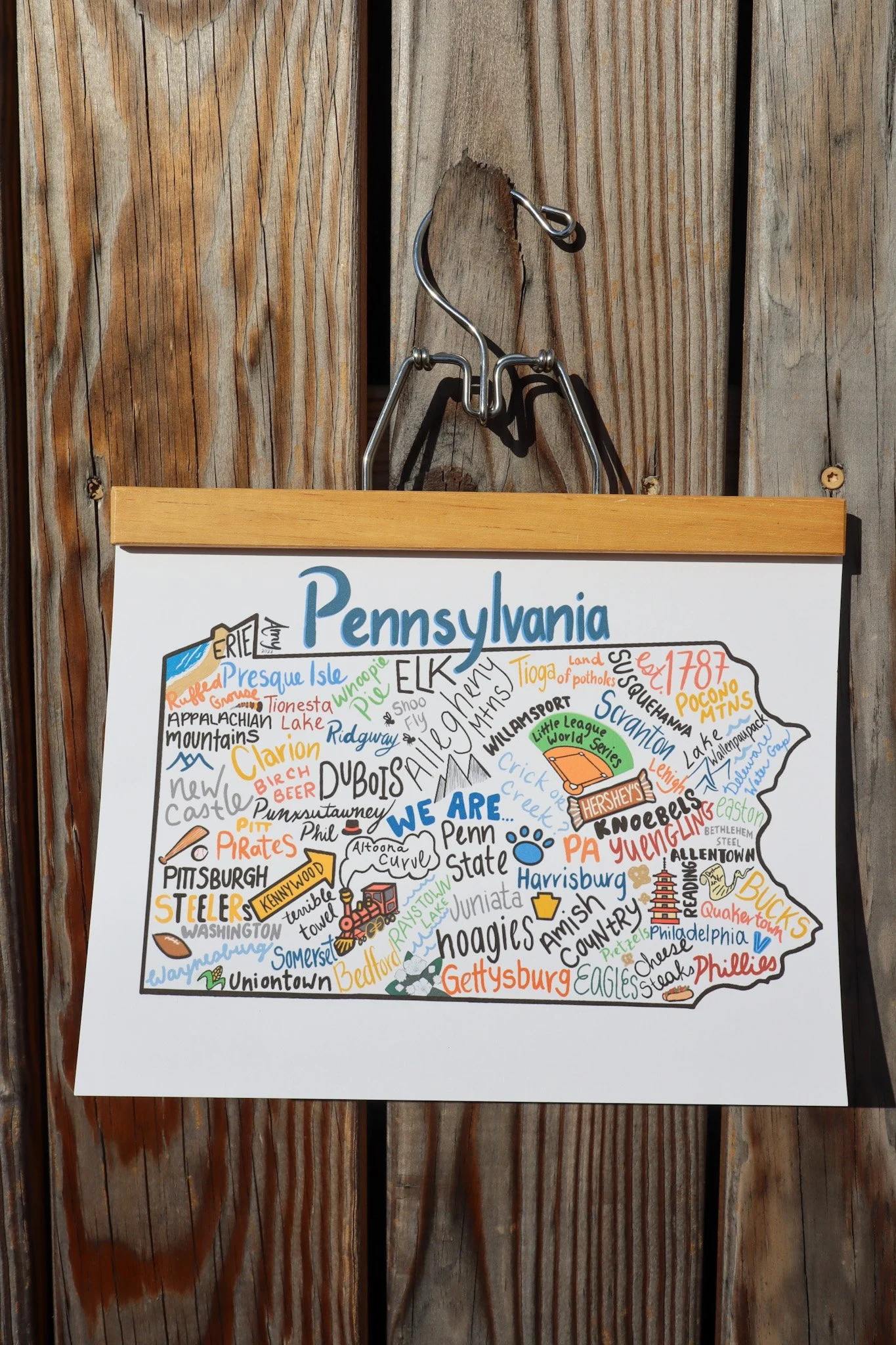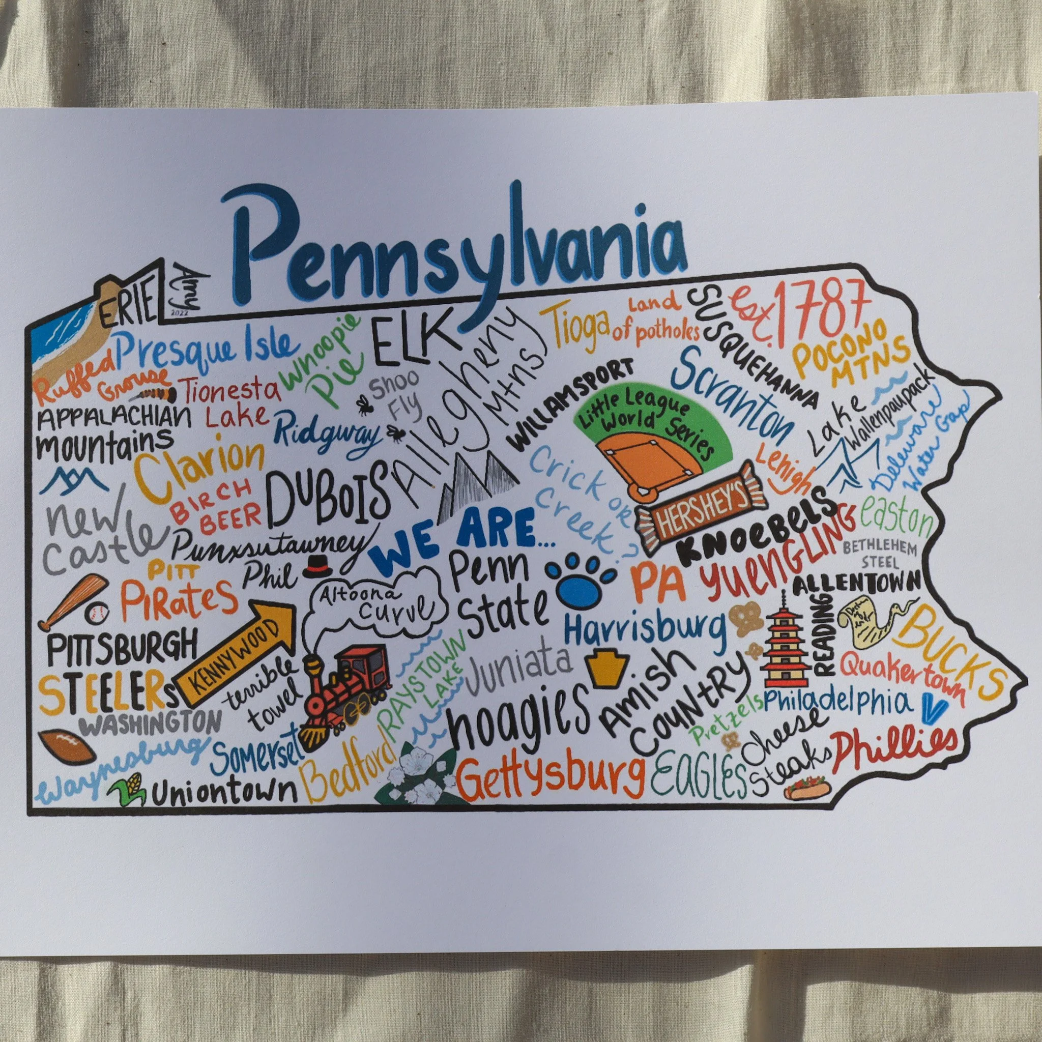 Some of my favorite places in PA on a map of.. you guessed it! PA! A fairly big sticker of places and attractions in PA! Make sure to zoom to see if your favorite towns are included! There are tons of small towns in this sticker, but some of my favorite things in this sticker are: Penn State, crick or creek?, land of potholes, Raystown Lake, Pretzels, Lehigh, etc.